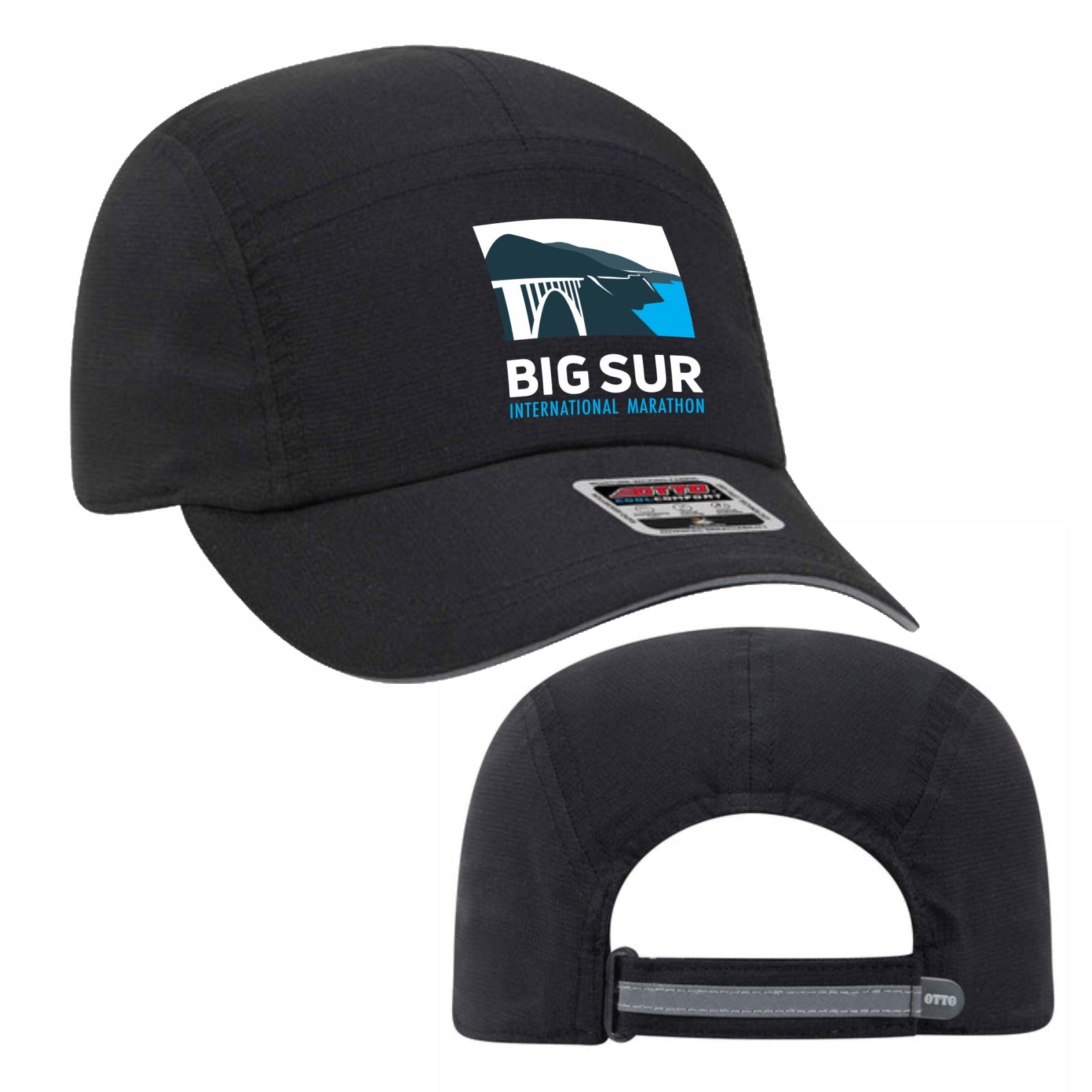 Big Sur International Marathon Embroidered Headwear. Technical 5-panel unstructured running cap featuring Pongee panels, reflective back strip on velcro strap, soft front panel, black underbrim, moisture-wicking and antimicrobial sweatband. OSFM. Item ID biphgC211